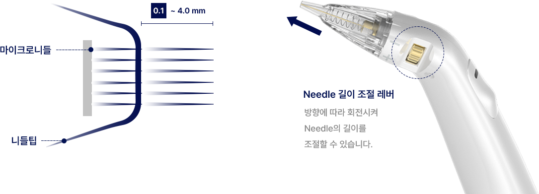 최소 0.1 mm에서 최대 4.0 mm 깊이까지 0.1 mm 단위로 바늘 깊이 조절